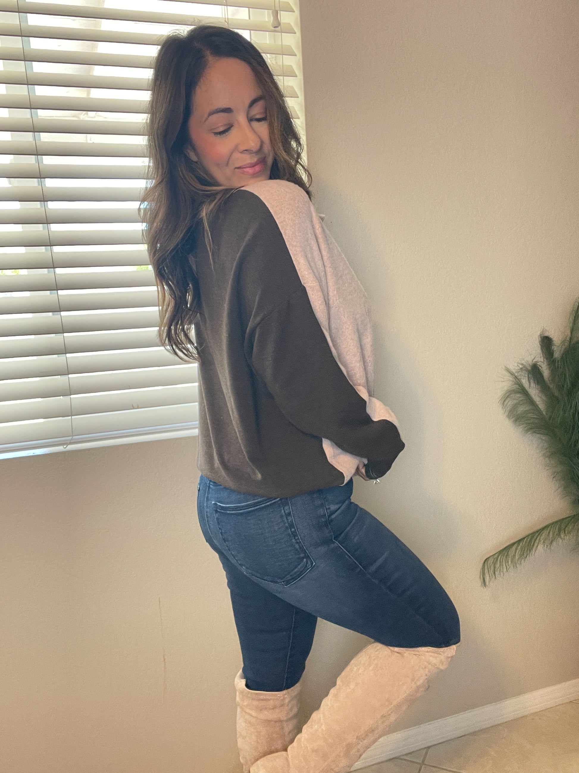Pretty mocha and brown soft brushed pullover, two toned. Button neckline