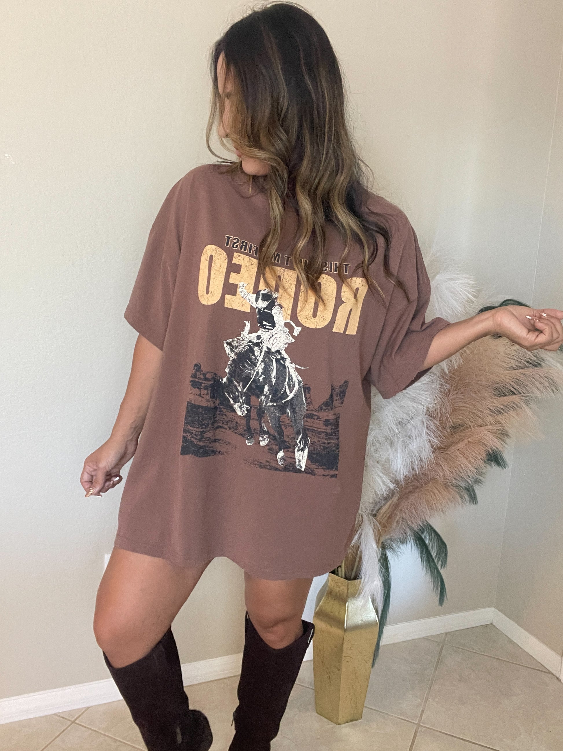 Our black washed western graphic tee features the bold phrase "ain't my first rodeo" alongside a dynamic cowboy bull-riding illustration, highlighted with faded orange lettering for a vintage, worn-in look! Perfect for those who embrace a rugged, confident style!